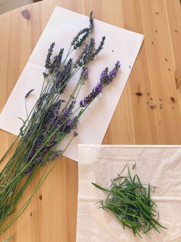 咲いてしまったラベンダーは香りが弱い&花が落ちちゃうので、ドライフラワーにはできません。らしい。とりあえず収穫して葉っぱだけ取ったけど…このあとどうする?どうなる?