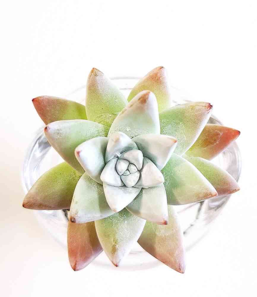 多肉植物の中で最も白い植物と言われており、強い太陽光線から身を守るために自ら粉を吹き白くなっている」