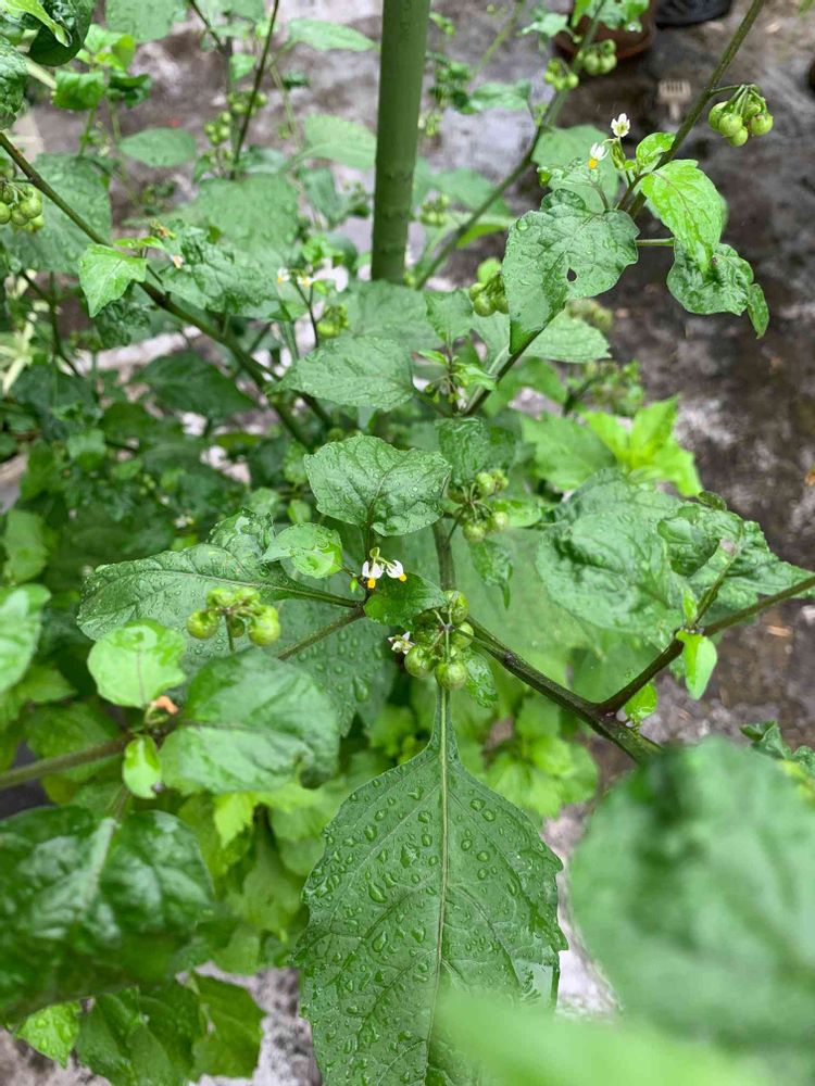 ほうづきの鉢に突然生えてきました。ナスの花に似てるけどトマトみたいな実もついてます。成長が早くてスクスクと伸びてほうづきが遠慮しながら同居してます。