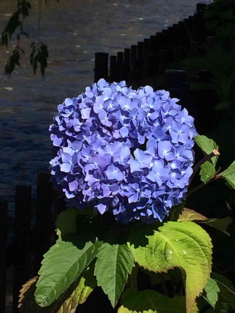 会社の帰り道の川べりのアジサイが朝日を浴びて輝いていました。