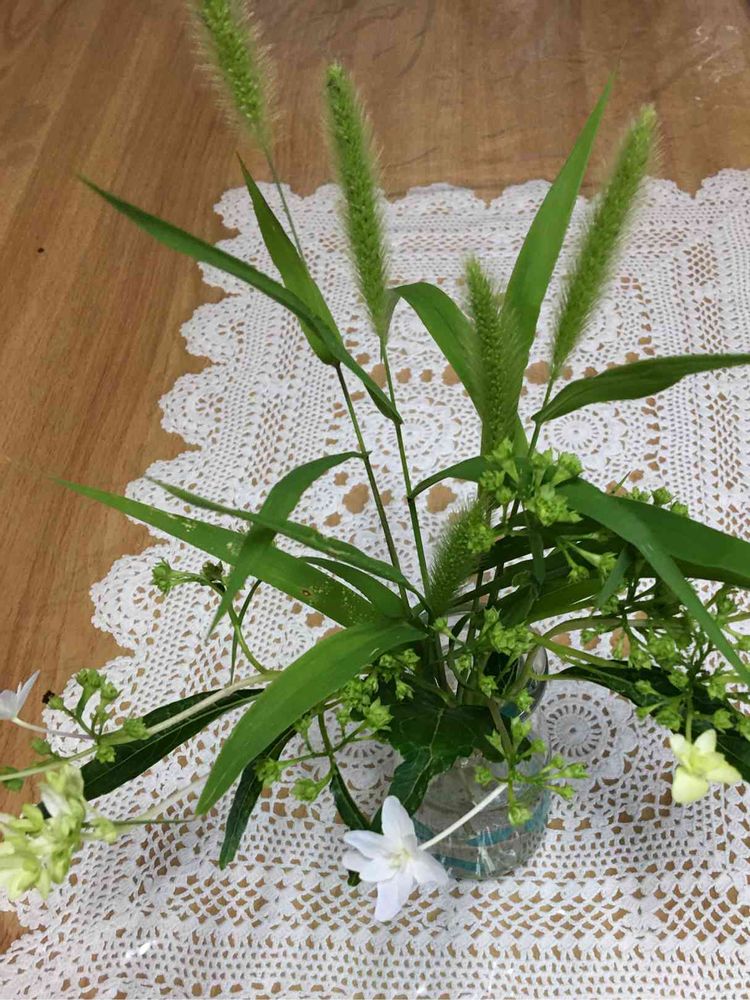 我が家の猫ちゃん🐱の遊び相手にと、散歩の途中に摘んで帰った草を一時的に紫陽花の花瓶に。