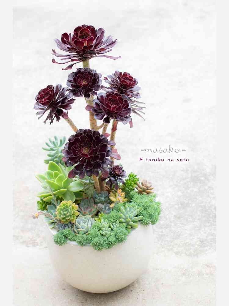 黒法師を中心の大作を作りたくて、この春作りました。セダムさんも、いい感じにもりもりになったので、夏越し頑張って欲しいです。