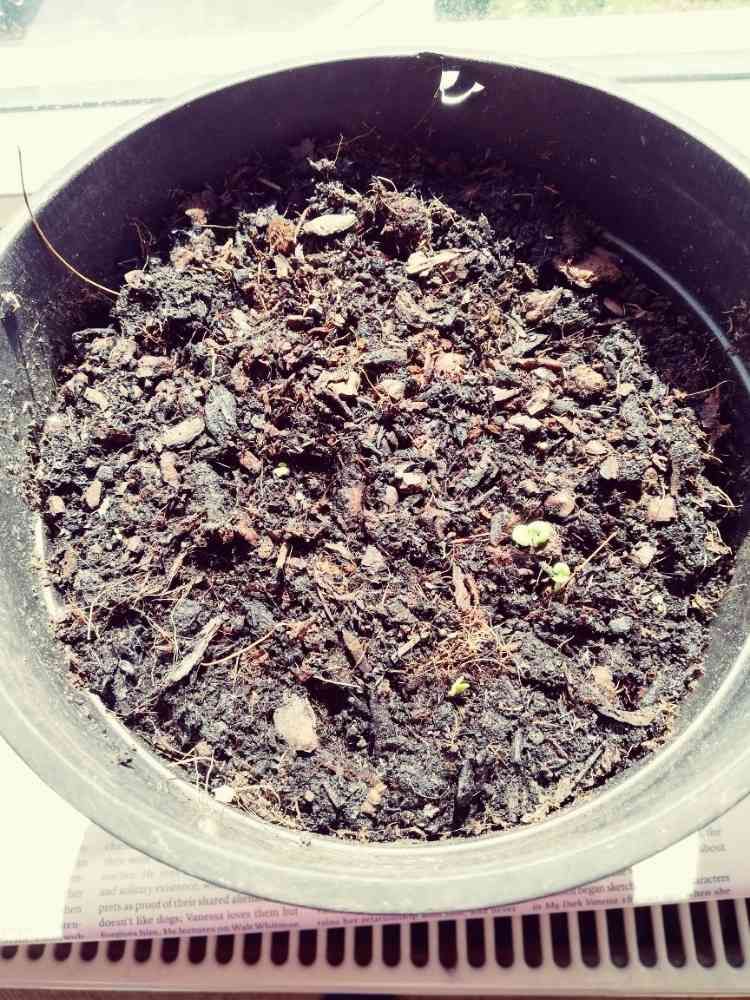 6月6日。小さな芽が出る。この後、外に出してたら。ある朝、1cmぐらいのかわいい芽たちが、忽然と、消えてた😭 覆いをしてなかったから、鳥に食べられたかも😢 窓辺に移動。