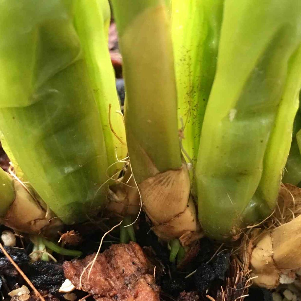 5/13に植え替え投稿から約3週間。この間で、あんなにプリプリだったバルブが激ヤセ。極限まで痩せてるのか、バルブの中身が透けるくらい。