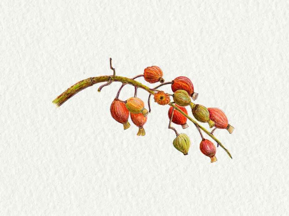 鉛筆でデッサン、PIGMAペンで仕上げから色鉛筆画で彩色しています。