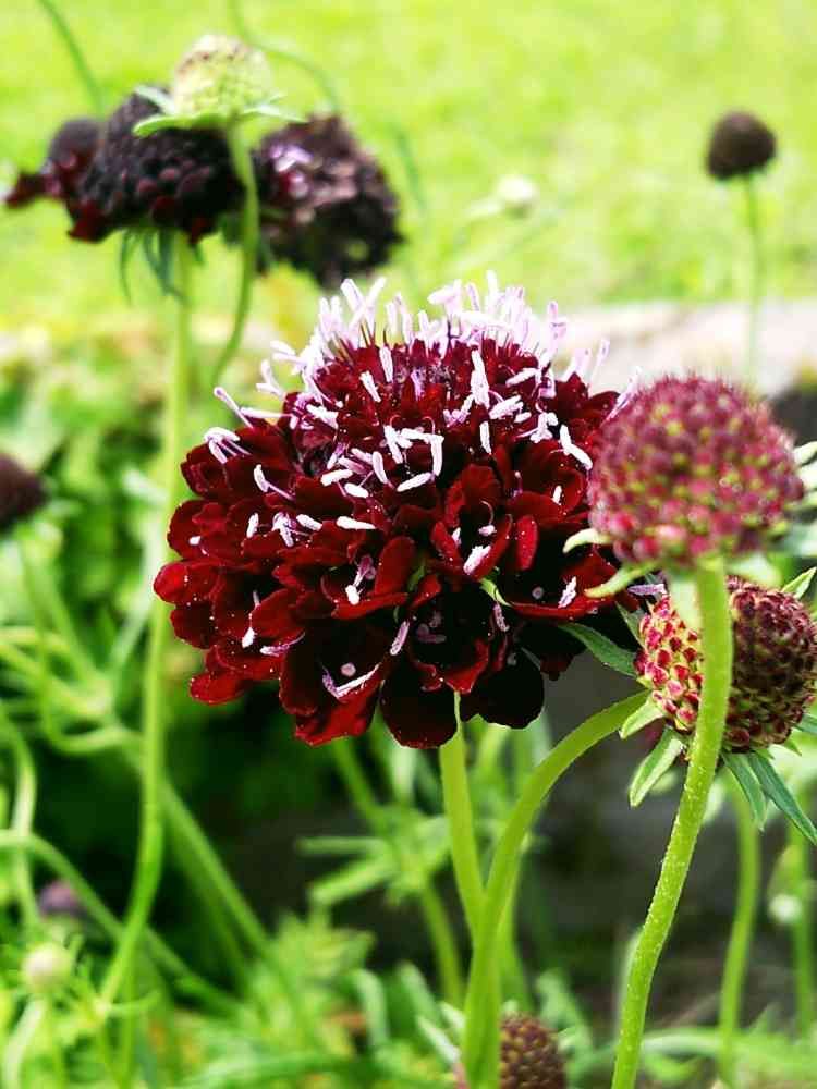 ワインカラーのスカビオサ、「バーカンディボンネット」のラベルだったけど、どうも違う感じで、調べたらどうも「ルージュカーマイ」みたいです😅