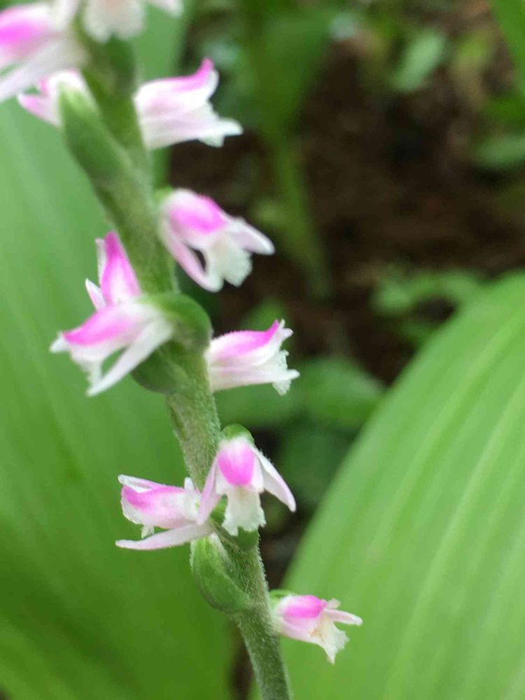 芝生の中にポツンと生えたピンク色の小さな花。螺旋のようにグルグルしてる。よーく見ると、お花はランのよう。