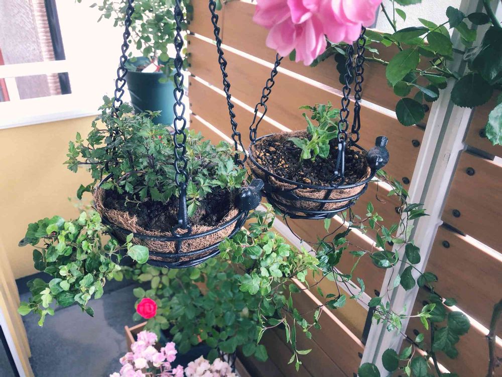 ニトリで小さなハンギングバスケットを買ったので、挿し芽して作った小さな苗を植えてみました♪