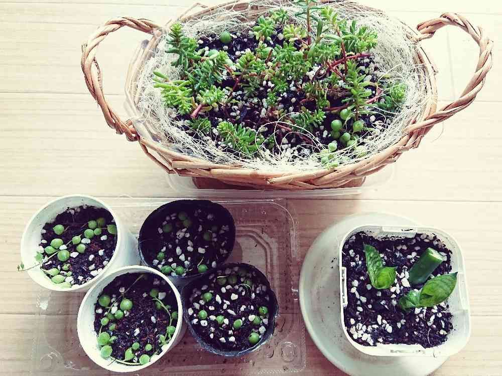 ついでに、根元が怪しくなってきたグリーンネックレスの葉挿しと、伸び放題のモリムラマンネングサ(多分)のお手入れ。