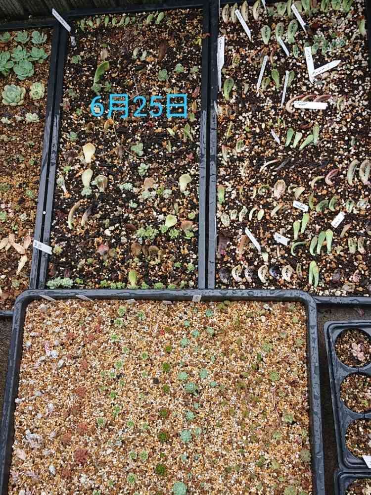 稲🍚育成箱😆に、雨晒しの葉挿しっ子達🎵(上)とセダム育成(下)