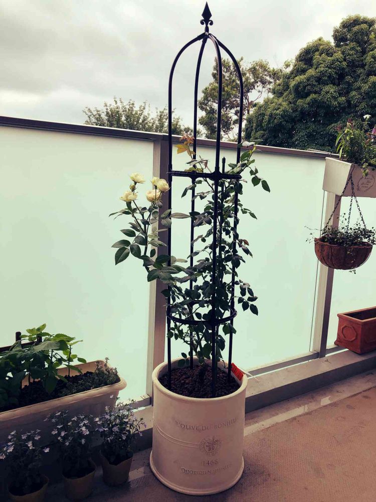 バラをいただいてから2日。オベリスクをつけて満足しています。病気など気をつけて枯らさずに育てるぞ。