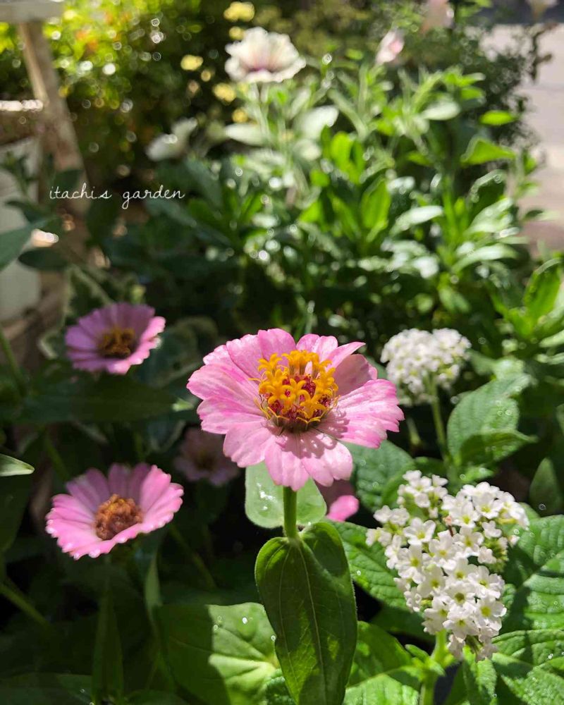 ピンクのジニアと白のヘリオトロープの組み合わせがいいですね🎵