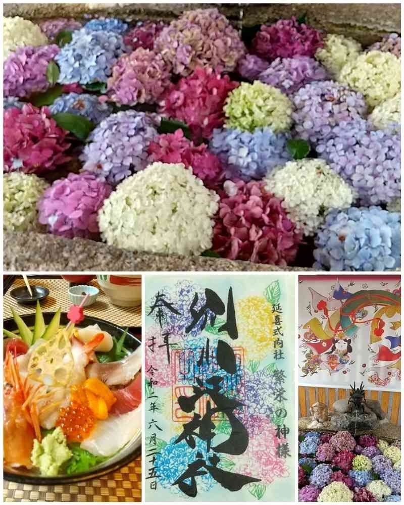 いろんな色の紫陽花が手水舎に浮かべてあって🥰
