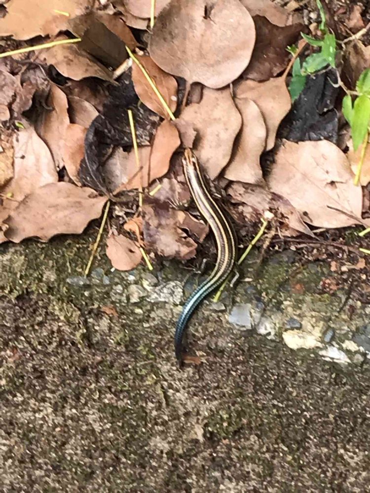 関西方面で見られるのがこのニホントカゲですよね〜 背中が縦縞模様で…関東はもっとしっぽの長いカナヘビです! 我が家の庭に毎日顔を出します😊