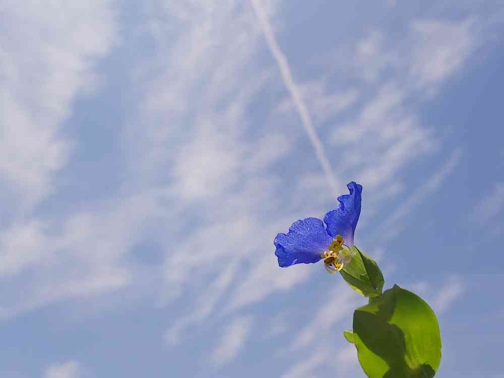 飛行機雲がツユクサを貫いた