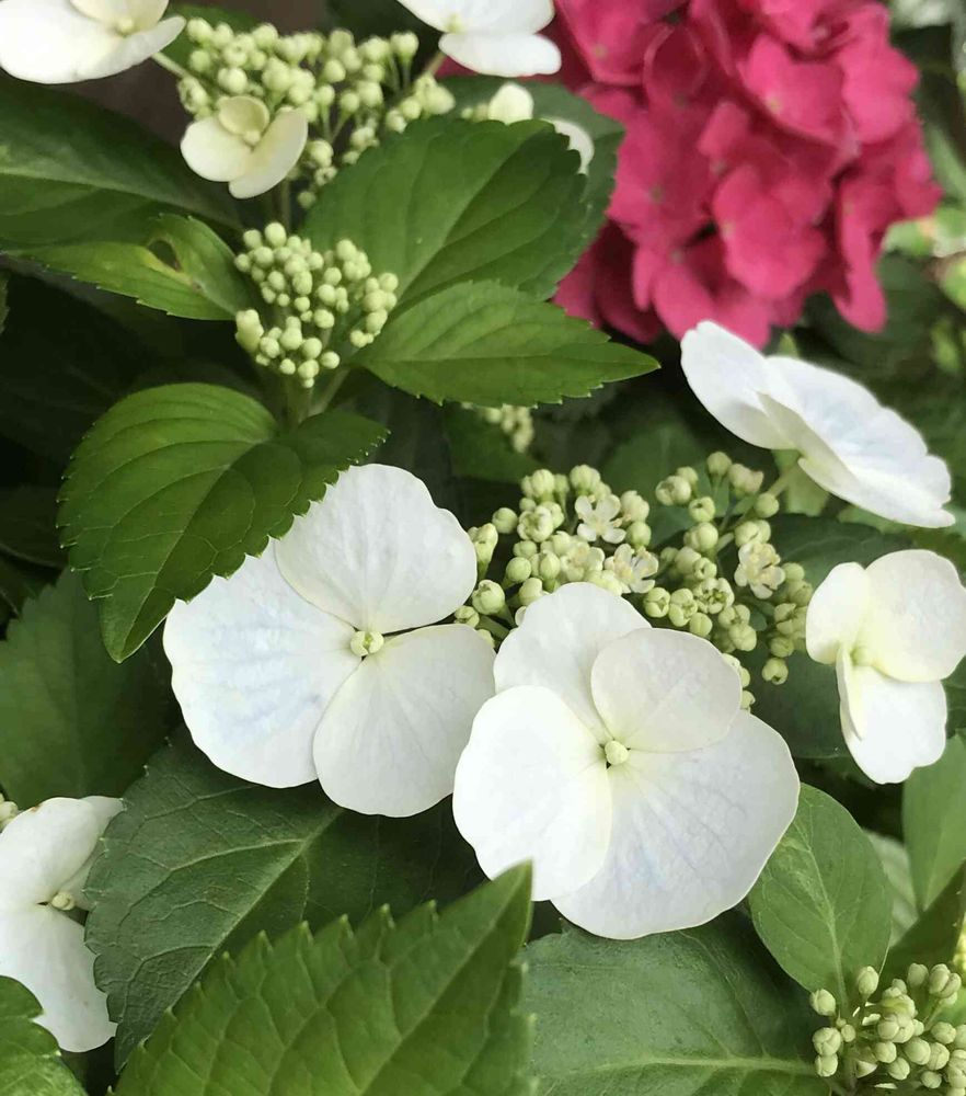 紫陽花の【ホットレッド】と【ブライダルシャワー】が頑張って咲いています。