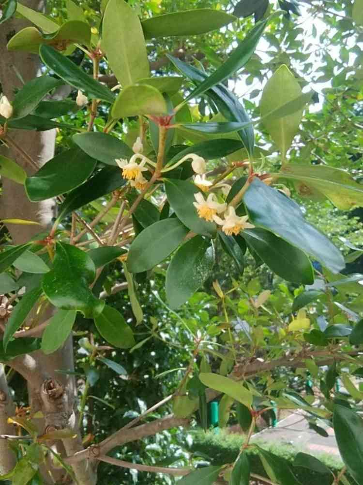 ツバキ科モッコク属の常緑高木。雌雄異株で、雄花だけを咲かせる雄株と両性花を咲かせる雌株がある。コレは雄株。両性花は、雌しべ柱頭が飛び出ていて、その基部を黄色い雄しべが囲んでいる。