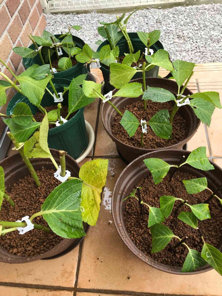 植木鉢8個、合計17種類のアジサイの発根待ち。(段差の下にも2鉢)
