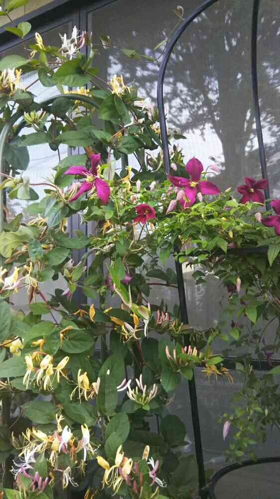 クレマチス マダムジュリアコレボンとハニーサックルのオベリスクが隣り合ってます☺お隣へ進出しようとしてるところです😆🎵🎵