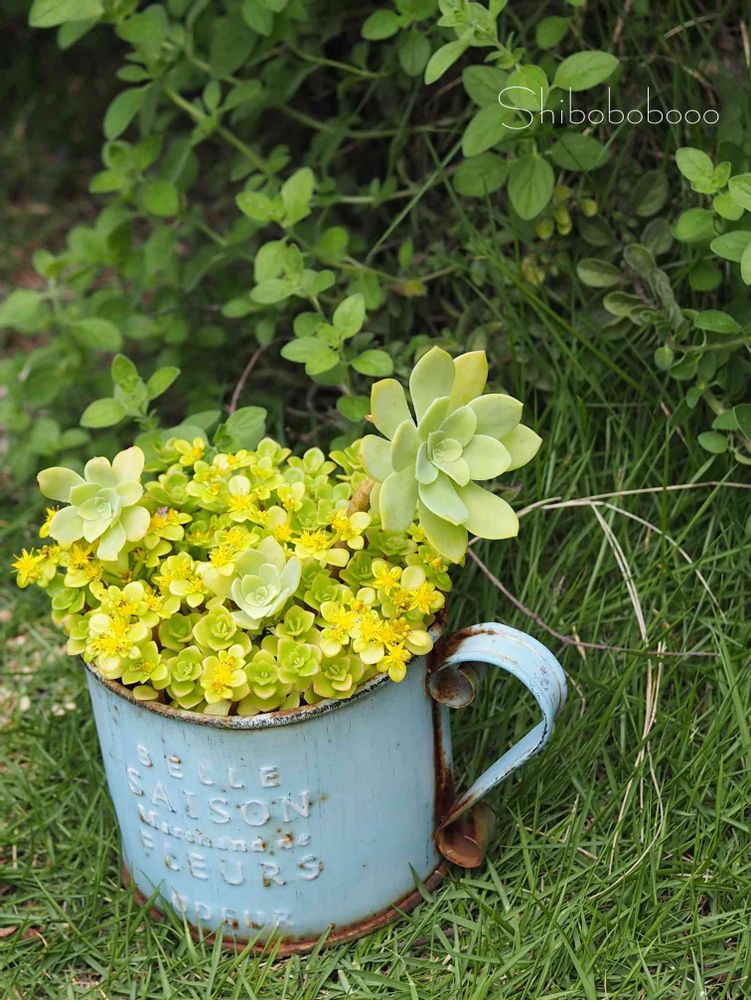 この春、黄金丸葉万年草の可愛さに気づき、カップに挿しました。