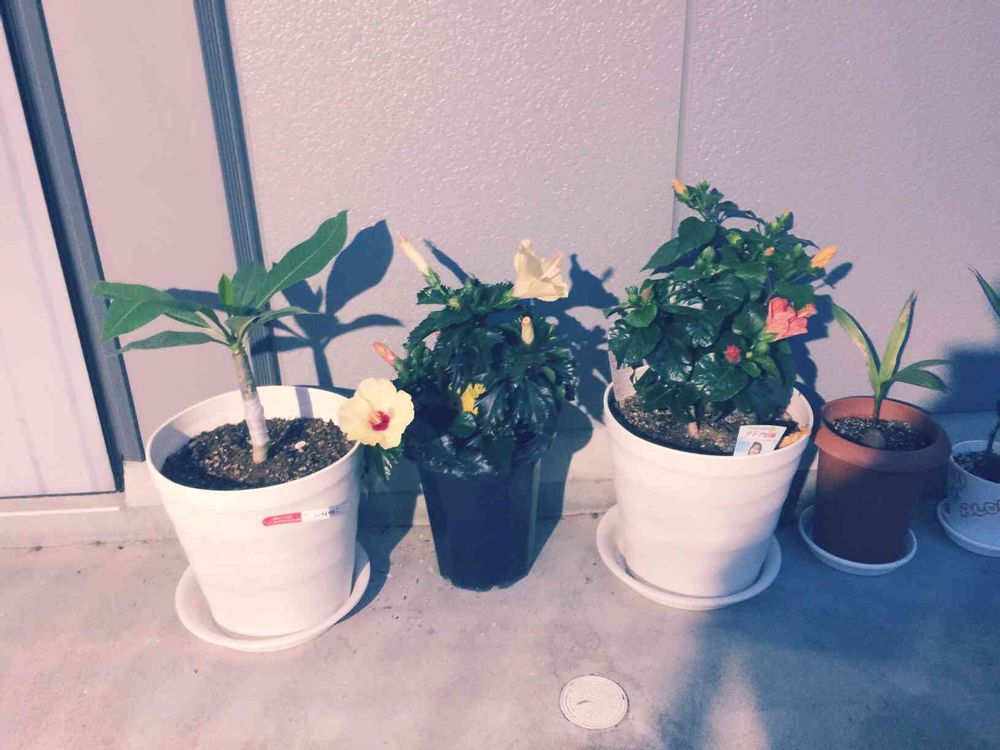 左からプルメリア ハワイアンイエロー🌱各種ハイビスカス🌺そしてアレカ カテチューと言うヤシの木🌴