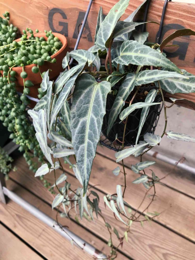 細く青みがかった葉で、羽裏は薄赤紫、どんどん蔓を伸ばしていくみたいです。