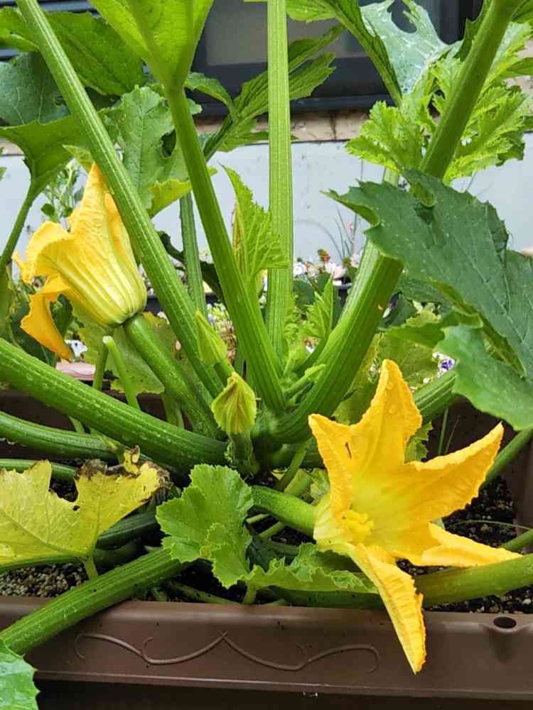収穫を楽しみに初めて植えたズッキーニ。2,3週間前から毎日花は咲くのですが、来る日も来る日も雄花ばかり……半分諦めかけていました😅。