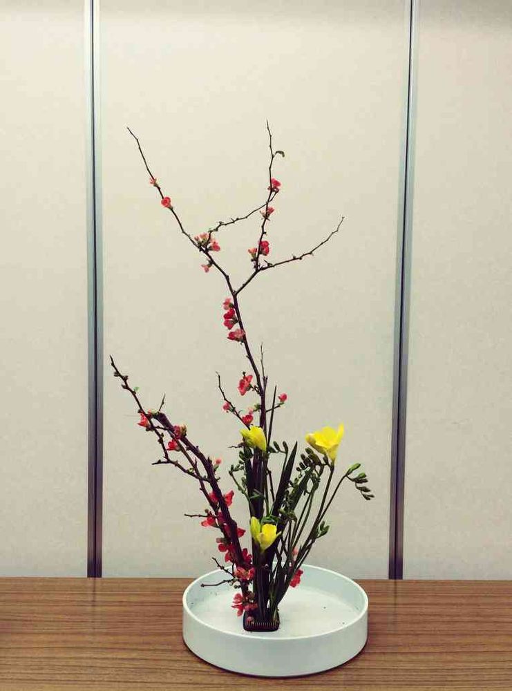 すてきな曲がりの木瓜の枝。フリージアはいいにおい。