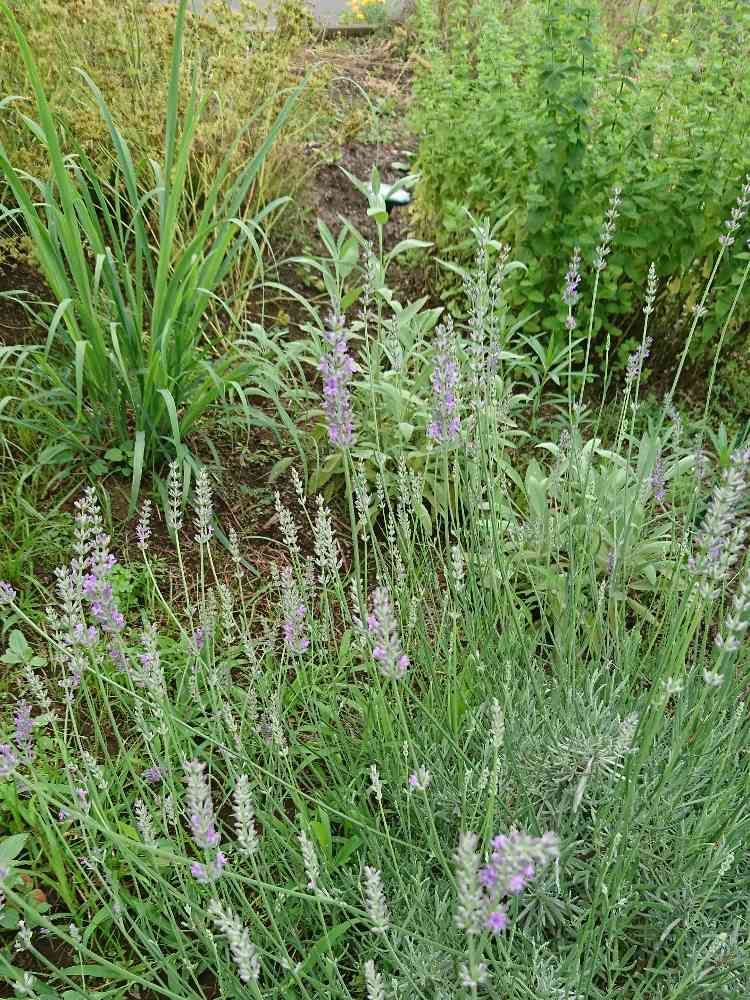 ラベンダー越しのレモングラス、アップルミント、コモンセイジ🌱