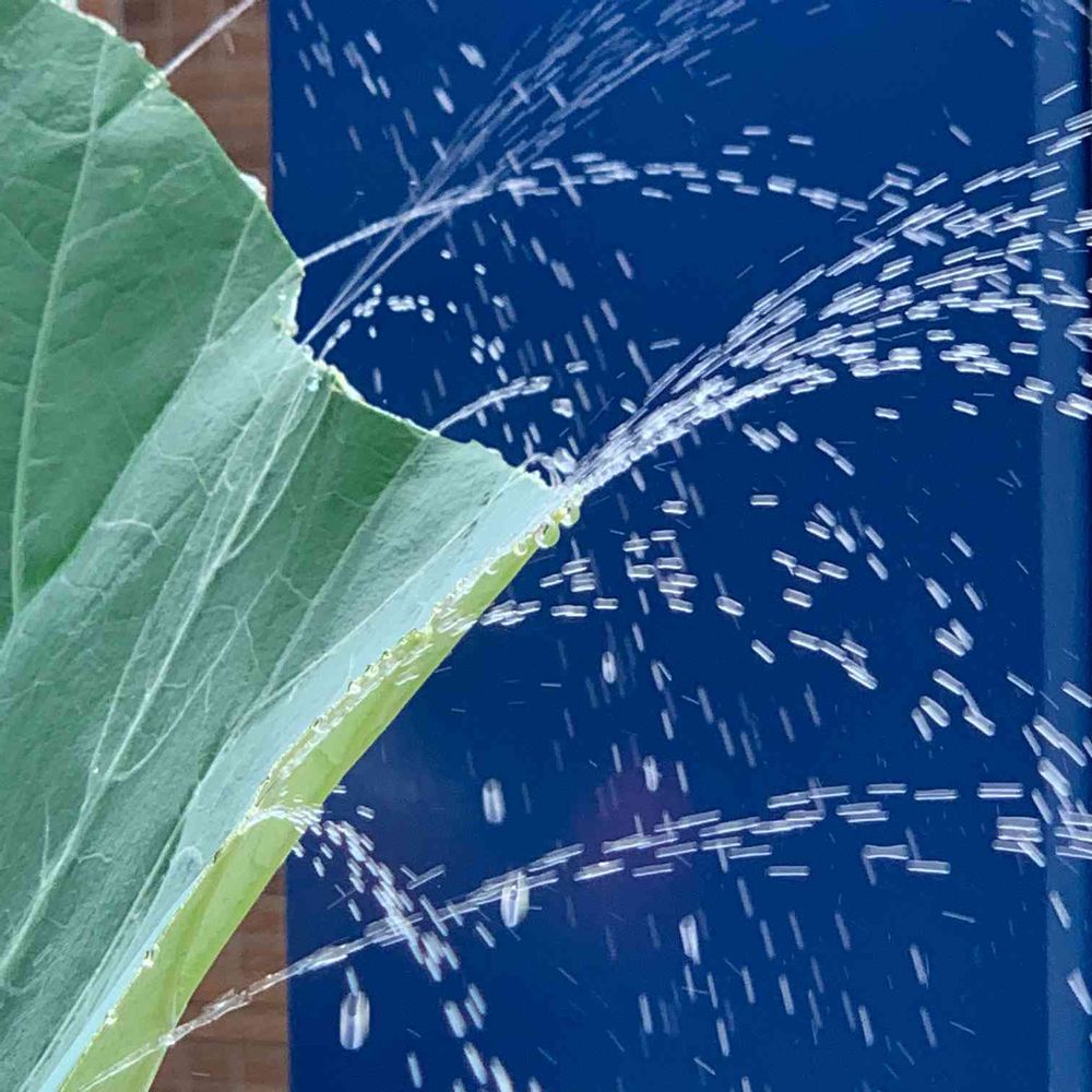 蓮の葉っぱには、レンコンの穴のように先まで穴が通っているそうです。なのではすの葉っぱの縁を一周切り取ることで穴が開通することに。