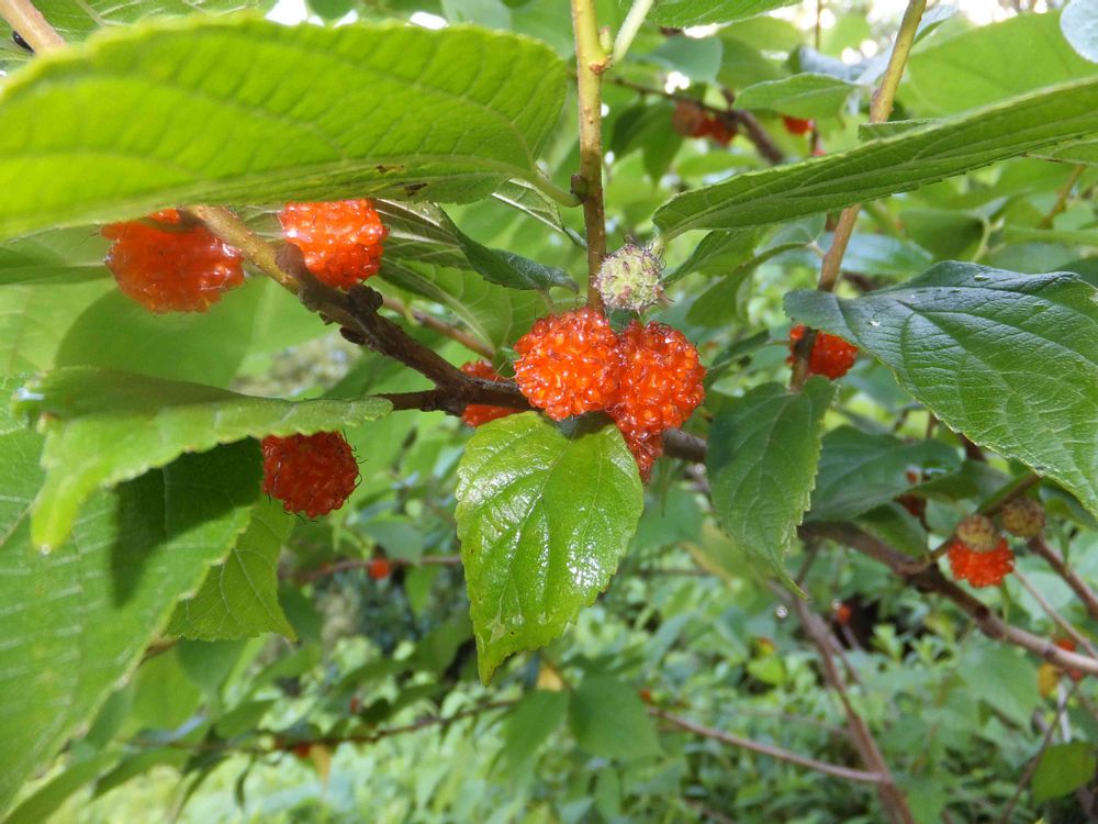 朝の通勤途中。 ツツジの中から飛び出ている桑のような木に、おいしそうな実がなっていました。 パチリ。