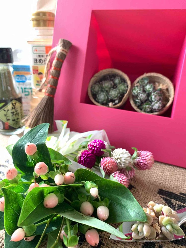 中身は、かわいいピンクの実がかわいいヒペリカム💕私が、育ててたのをダメにしたって言ったら、あげるよって言ってくれました😆💕それだけじゃなくて、ドライフラワー用の千日紅これも私がずっと憧れていた花です💕