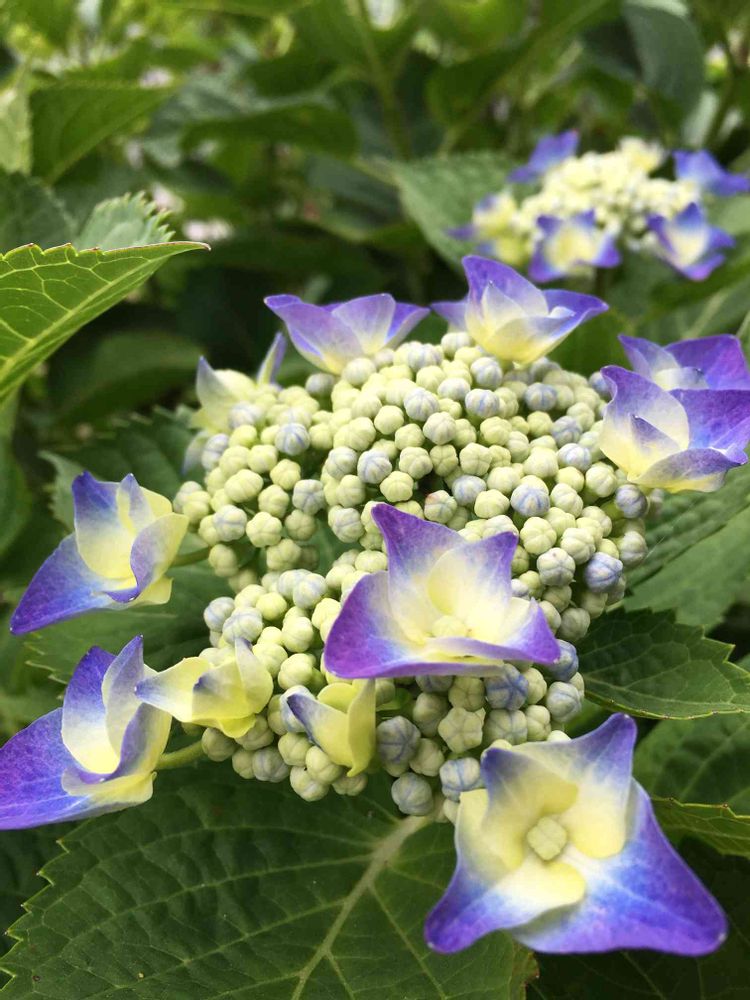 この紫陽花の隣に実家から もらってきたピンクの紫陽花を植えたら、3年前くらいから ピンク色と紫色が混ざって咲くようになりました(^-^)