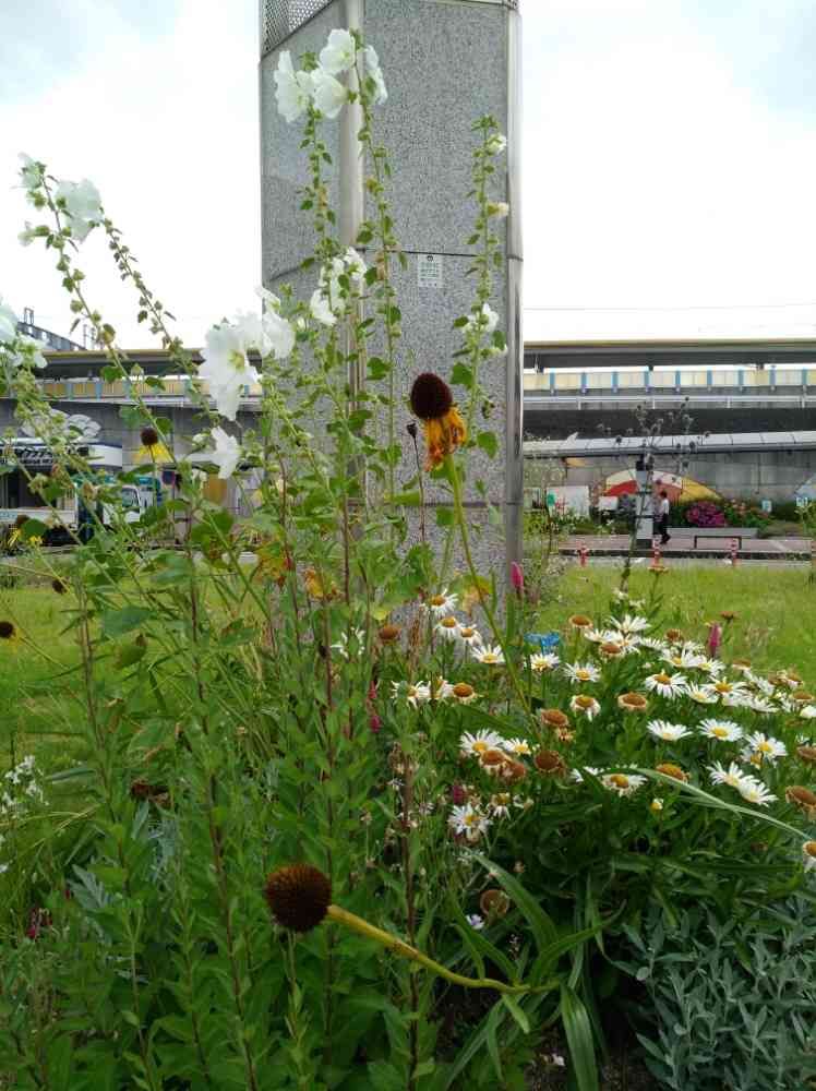駅前の花壇 白のタチアオイでしょうか⁉️
