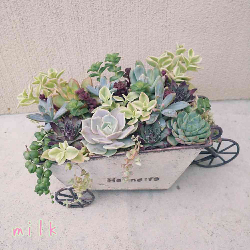 カートの色にローラの色が合ってて優しい寄せ植えになりましたね💕