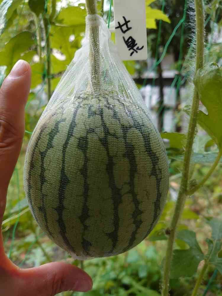 4/30に植え付け、6/12に人工受粉した、空中栽培中の小玉スイカのウブ毛が消えたタイミングで、吊り下げ保護。