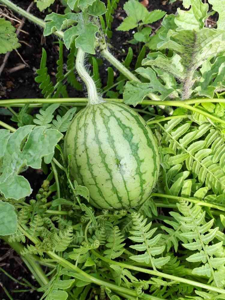 小玉スイカ🍉直径5センチくらい✨一応下に草敷いてみました。これからいろんな外敵から守らねば💪