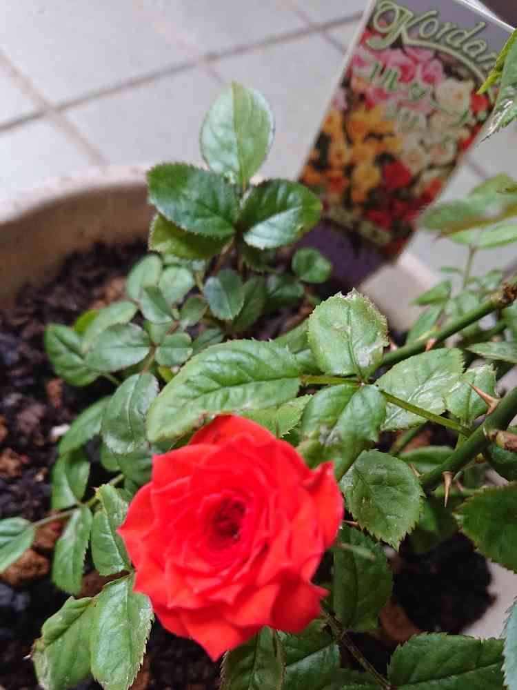 5月にホームセンターで100円で購入。当時は真っ黒に枯れた葉や枝が絡みつき、悲惨な状態だったけど、ようやく一輪咲きました。どんな花が咲くかもわからなかったが真っ赤なミニバラでした🌹