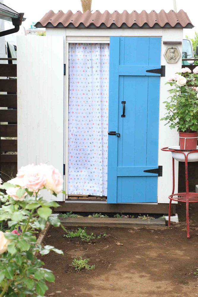 ドアの色も迷ったのですがブルーで正解でした〜♪中はガーデン用品いっぱいなのでカーテンで隠してみました😊✨