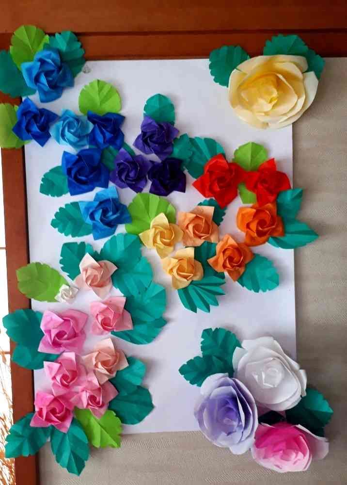 今朝は早く目が覚めてしまったので、長女が折りためた折り紙ローズ🌹に、葉っぱをせっせと作って飾り付けてみました☺