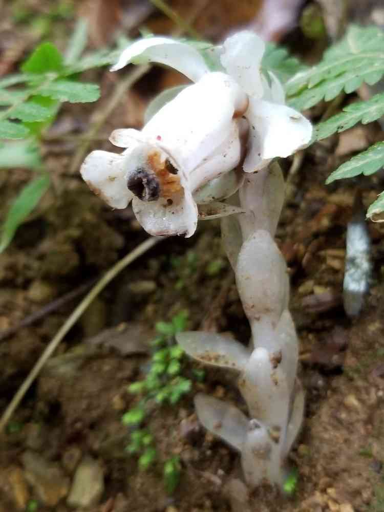 全体が白く、緑の葉をもたない腐生植物(腐葉土の上に生えて、その養分を分解する菌と共生して成長する植物)
