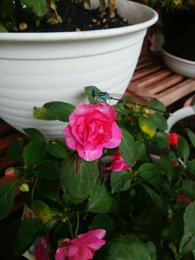 八重咲きインパチェンスとイトトンボ😊