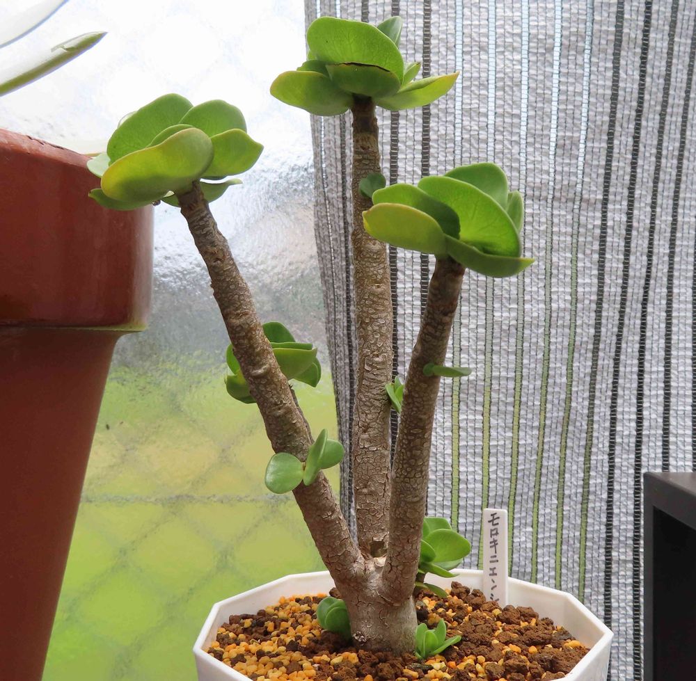 よっやくあちこちから子供が出てきたモロキニエンシス。木立で枝分かれして何カ所も葉が出た姿はなんともユニーク。毎年冬に葉を落とすので今のうちにいっぱい葉を増やしておきたい。