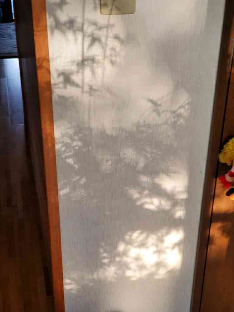 ではなくて、今☔上がりで山に沈む太陽が中庭のもみじをトイレの前の壁に映し出してこんな水墨画のような画を作り出しました。