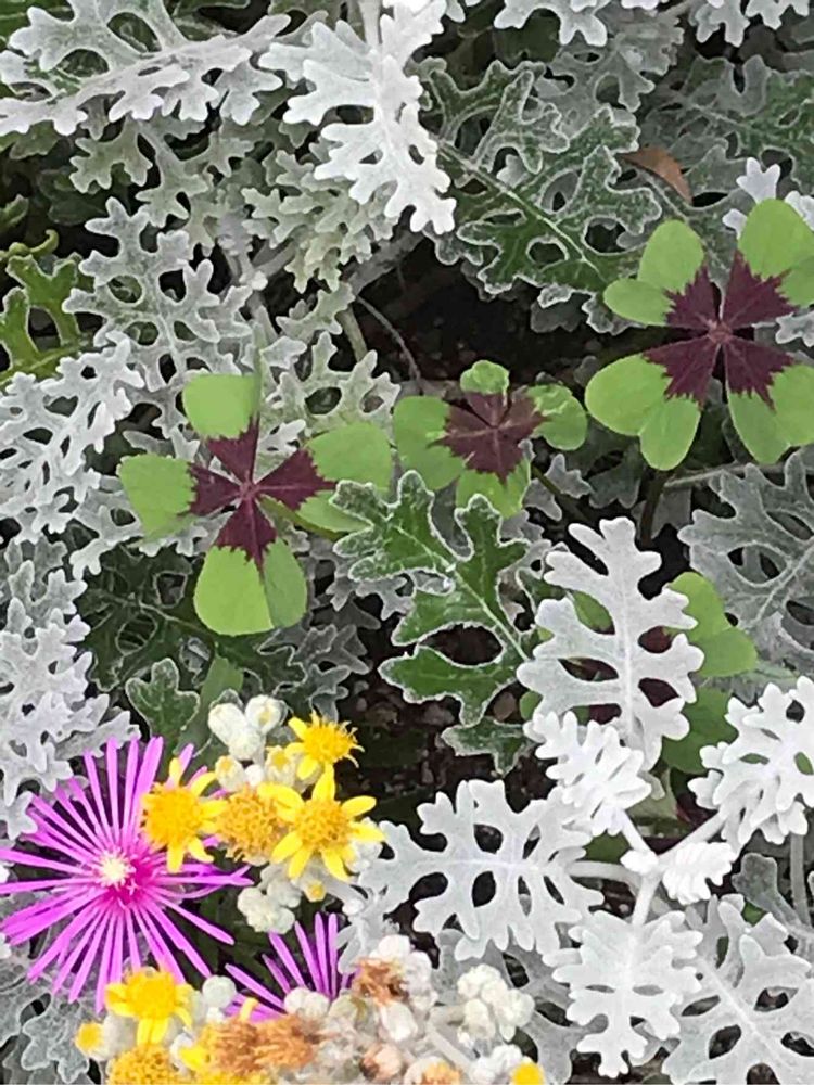 さん、ありがとうございます😊シロタエギクはずっとこのシルバーを保って目を楽しませてくれるし、その間からラッキークローバーが顔を出し🍀可愛いさ倍増💕です。