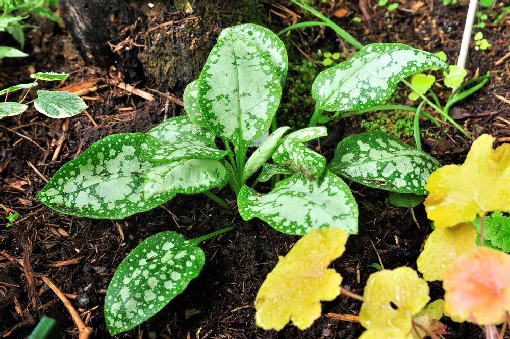 春の代表花のひとつ、プルモナリア。シルバーの斑入り葉で、青白い花。花は終わっても特徴ある葉はカラーリーフとしても重宝する素晴らしい品種です。