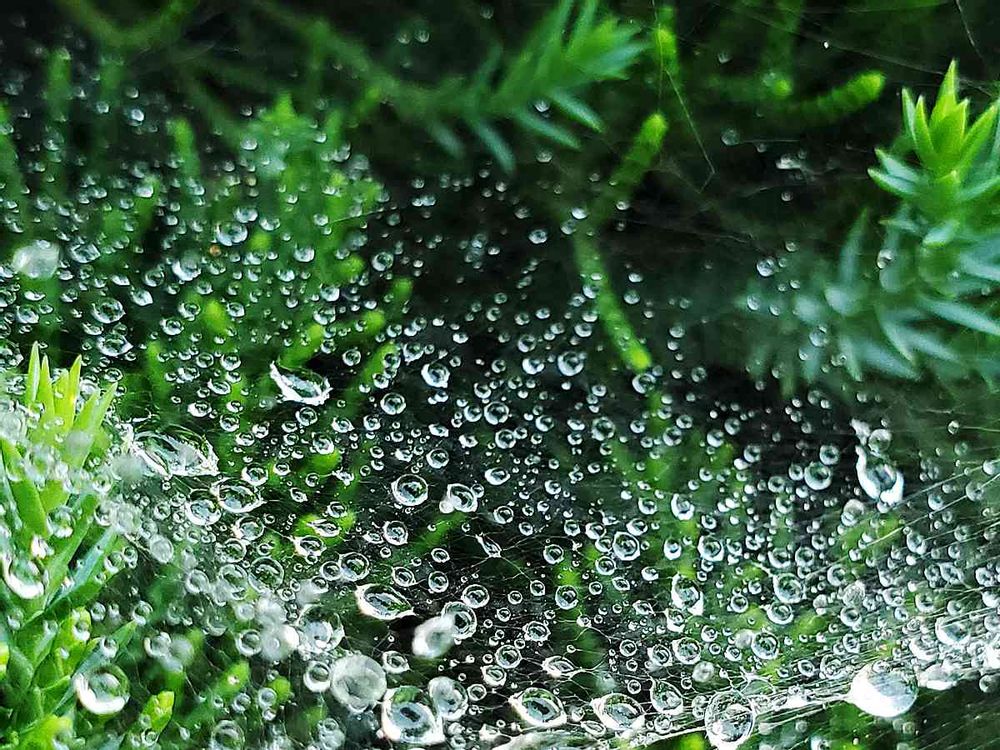 梅雨の一日、カイズカイブキ(貝塚伊吹)とクモの巣。