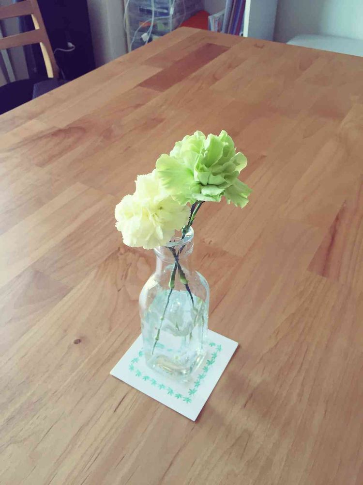 天国の義母へ贈ったカーネーションの終わりに、元気な花だけオイルボトル(花瓶が無いのでw)に挿してみた。