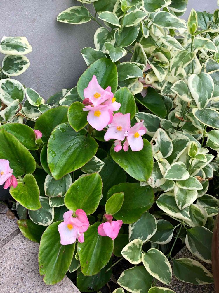 ベゴニアとツルニチニチソウが咲いています。