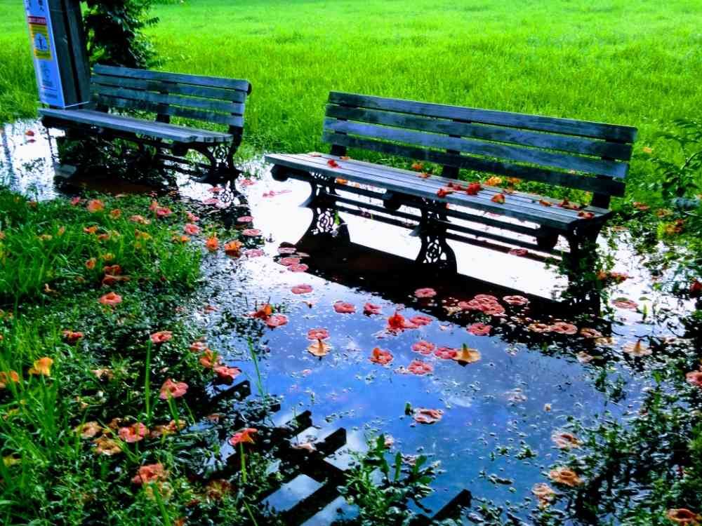 昨日の雨☔で、まるでノウゼンカヅラの花びらが、池に浮かんでいるようです。